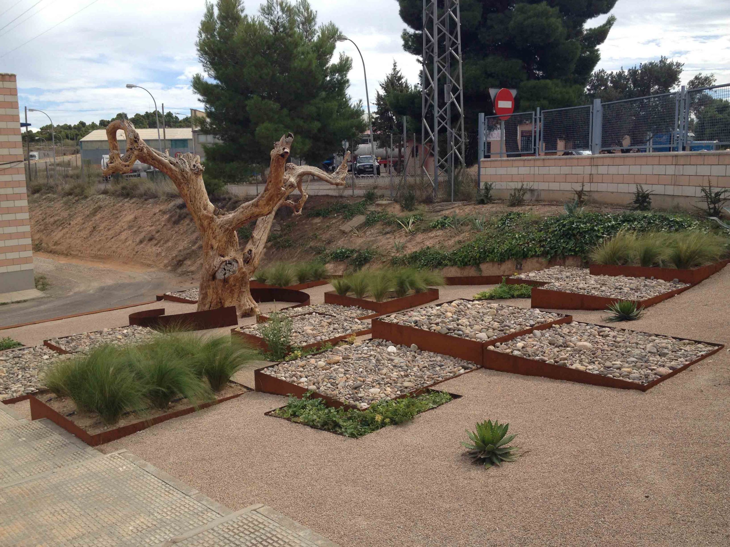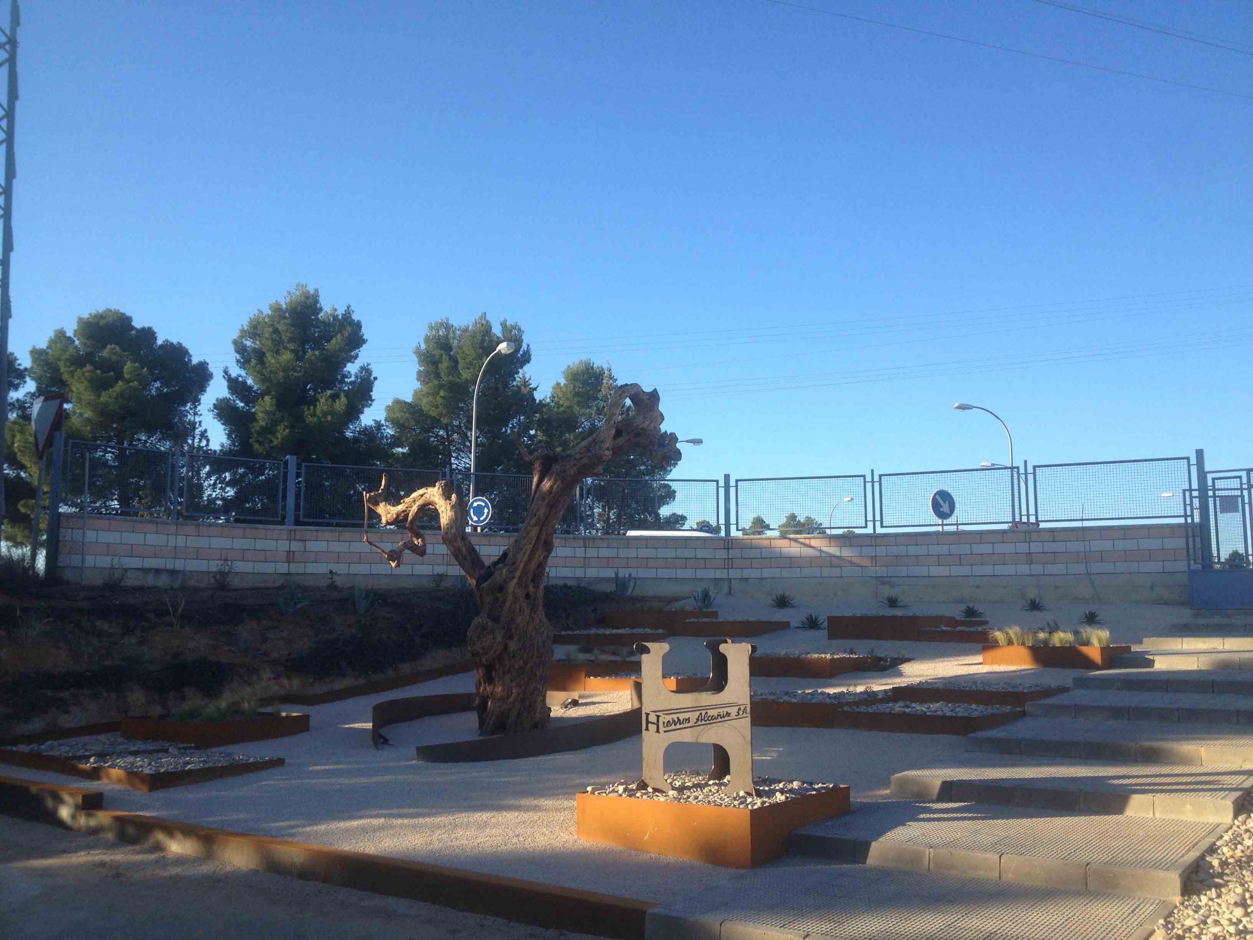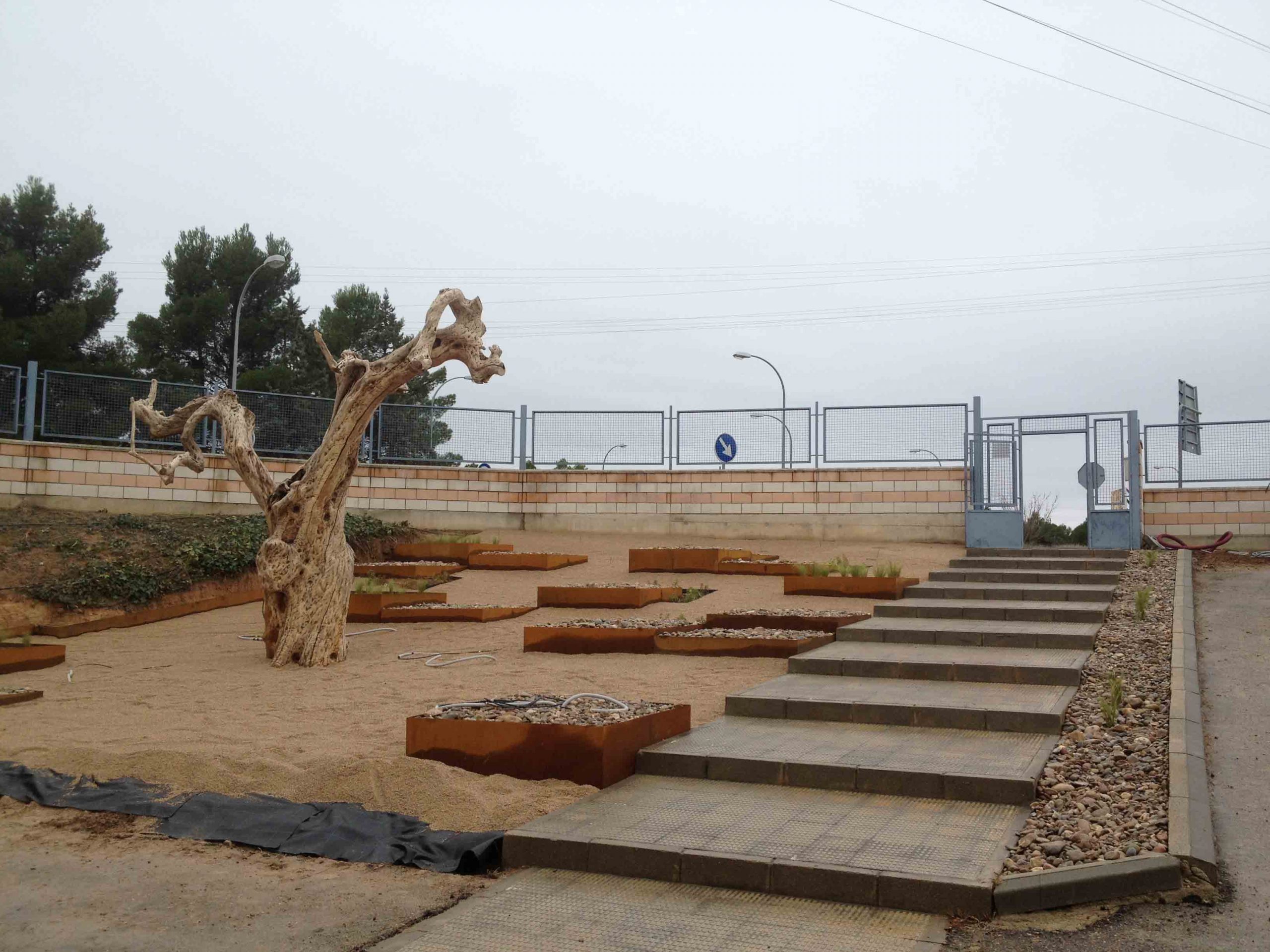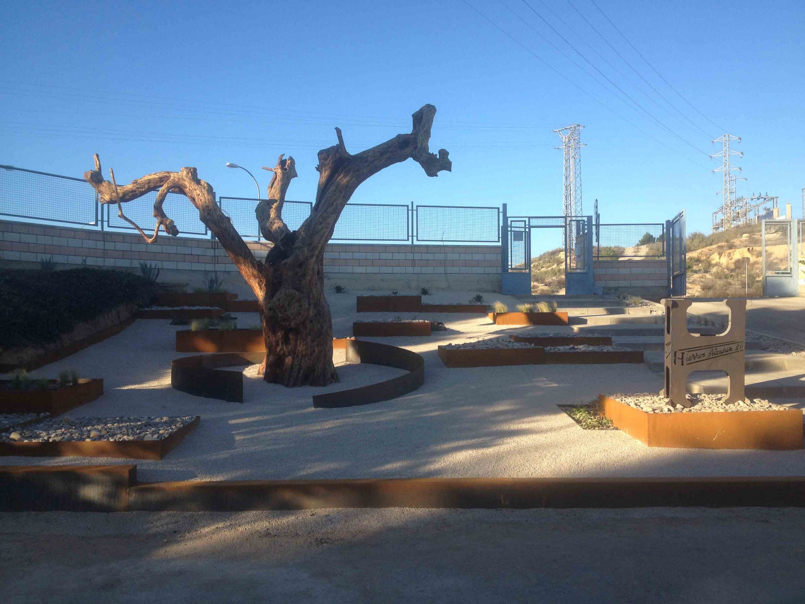 Jardineras metálicas encajan con la naturaleza del árbol, generando un paisaje creativo. Un aro metálico interrumpido rodea el árbol, evocando las hierbas que nacen junto a los arboles,